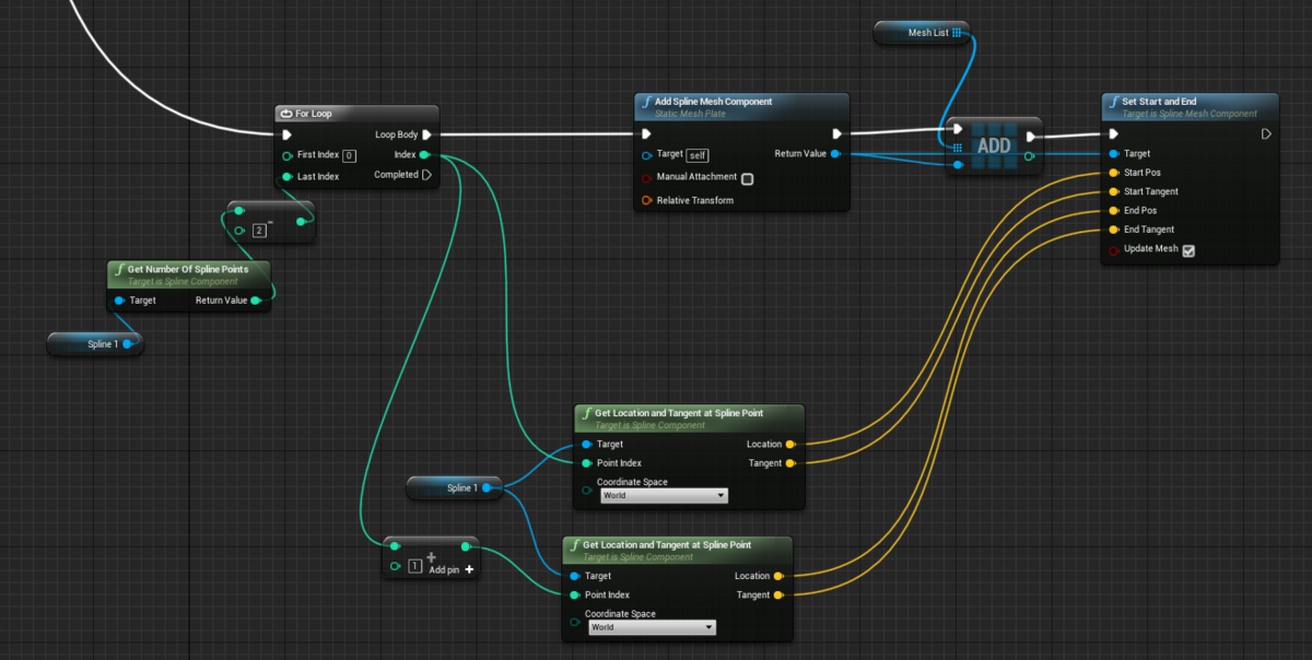The reason for creating the second SplineComponent here is that creating points at equal intervals results in a cleaner SplineMesh later.