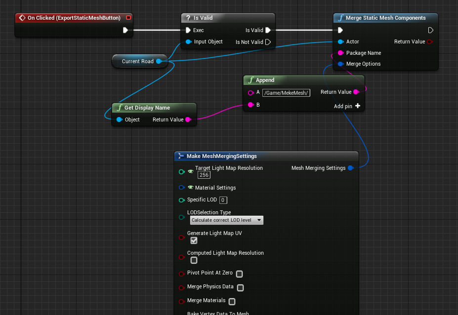 MeshUtilities.MergeComponentsToStaticMesh(AllComponents, AllActors[0]->GetWorld(), MergeOptions.MeshMergingSettings, nullptr, nullptr, PackageName, CreatedAssets, MergedActorLocation, ScreenAreaSize, true);